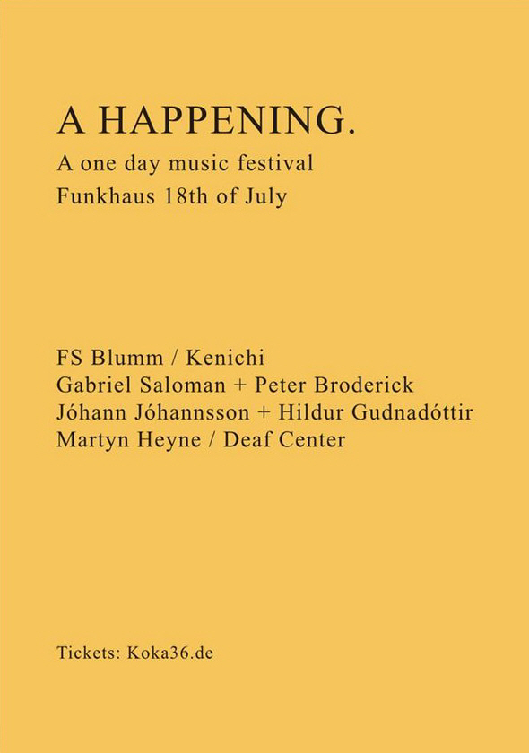 Set in Berlin's Funkhaus, an acoustical and historical treasure, tempered with a line-up worthy of a festival stage, A Happening... will showcase the relationship between artist and architecture, space and sound, audience and musician. In an oft-changing city, A Happening... provides the opportunity to be in and appreciate the now, while witnessing some of the finest experimental, ambient, and classical musicians collaborate with each other and the space.