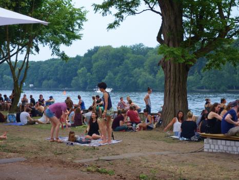 Fabrikhalle der ehemaligen Furnierfabrik mit Sheddach, dem späteren Fuhrpark des Rundfunkzentrums | Spreepark mit Riesenrad | Ufer mit Sommer-Partypublikum | Reederei Riedel | Teilabschnitt in Etage 5 im A-Block im Sommer 2015 | Kultursaal während der OpenStudios | Fotos © Elisabeth Heller