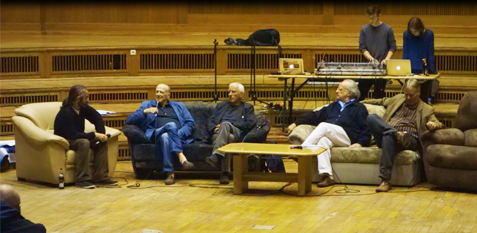 V. l. n. r.: Adrian Garcia-Landa, Kiez.FM, Wolfgang Kohlhaase, Drehbuchautor, Joachim Walther, Schriftsteller, Peter Gotthardt, Komponist, Peter Kainz, Studio H2 | Foto © Elisabeth Heller | 02. 10. 2015