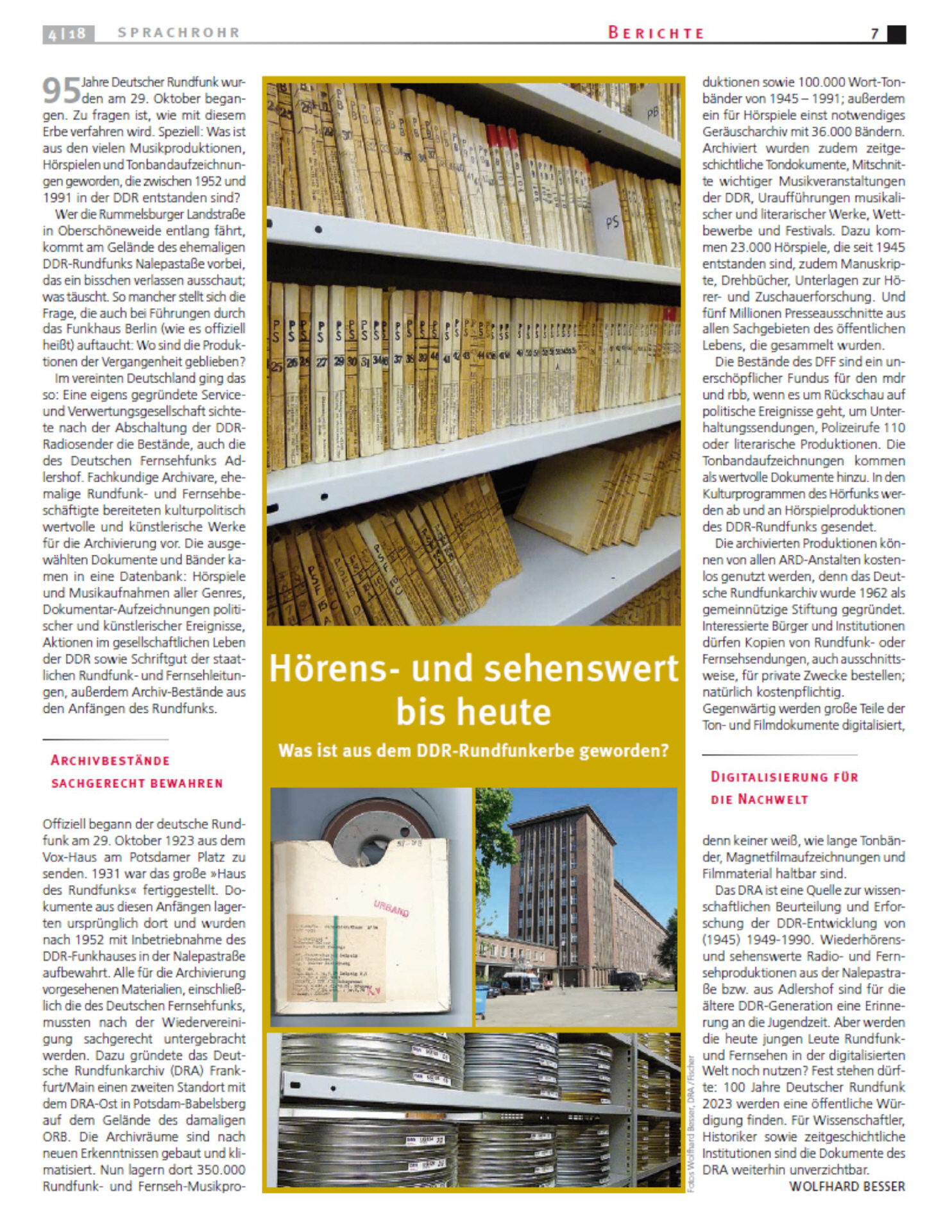 Überlieferungen des Rundfunks der DDR sowie des Rundfunks in der Sowjetischen Besatzungszone und des ostdeutschen Rundfunks der Wendezeit befinden sich im Deutschen Rundfunkarchiv. Dazu passend ein Beitrag des Zeitzeugen Wolfhard Besser im "Sprachrohr", der Ver.di Mitgliederzeitung des Fachbereiches Medien, Kunst und Industrie Berlin-Brandenburg | Ausgabe 4/2018, S. 7:
