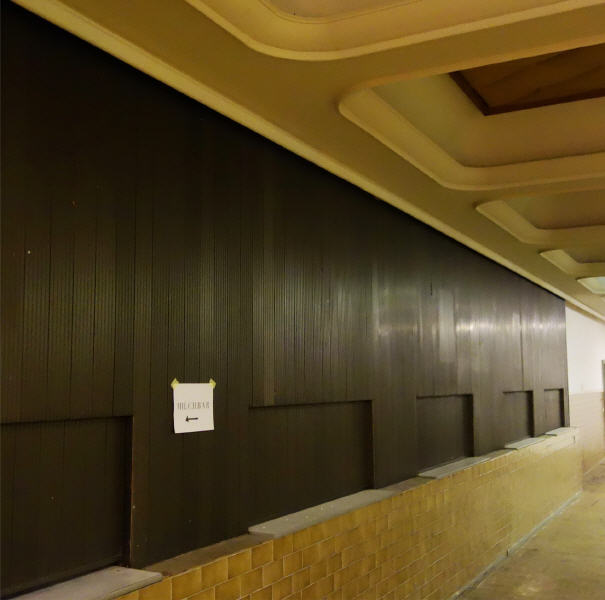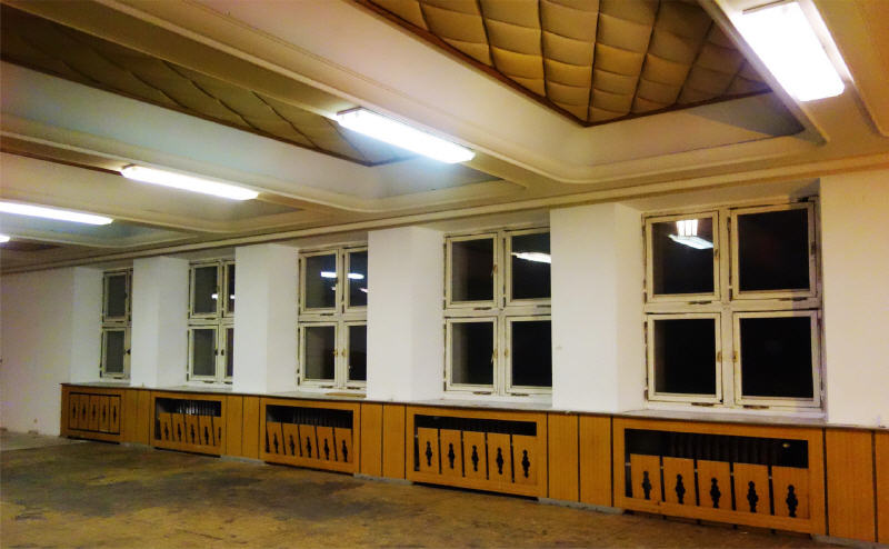 links: Blick in die ehemalige Kantine vor der Renovierung im Jahr 2016 | dazugehörig rechts unten: Fensterfront hin zur ehemaligen Kantine unten und Kultursaal oben | Bild rechts oben zeigt den Übergang von Block A nach Block C