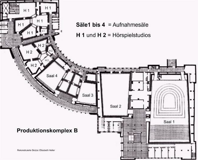Im Produktionskomplex B befanden sich u. a. das Geräuschearchiv, befinden sich bis heute die Säle 1-4, die Hörspielkomplexe H1 und H2