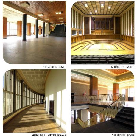 Was Besucher vor Ort mitunter zu verwirren scheint ist die Tatsache zu erkennen, dass der Architekt Franz Ehrlich damals auf repräsentative Auffahrten und Zugänge verzichtete. So befindet sich beispielsweise der völlig unauffällige Eingang hin zum Foyer mit Aufgang zu zwei großen Aufnahmesälen sowie dem als Reminiszenz an das Bauhaus verglaste und lichtdurchflutete Bogengang mit seinen großen Stahlfenstern im Erdgeschoss seitlich links des Produktionskomplexes B.
