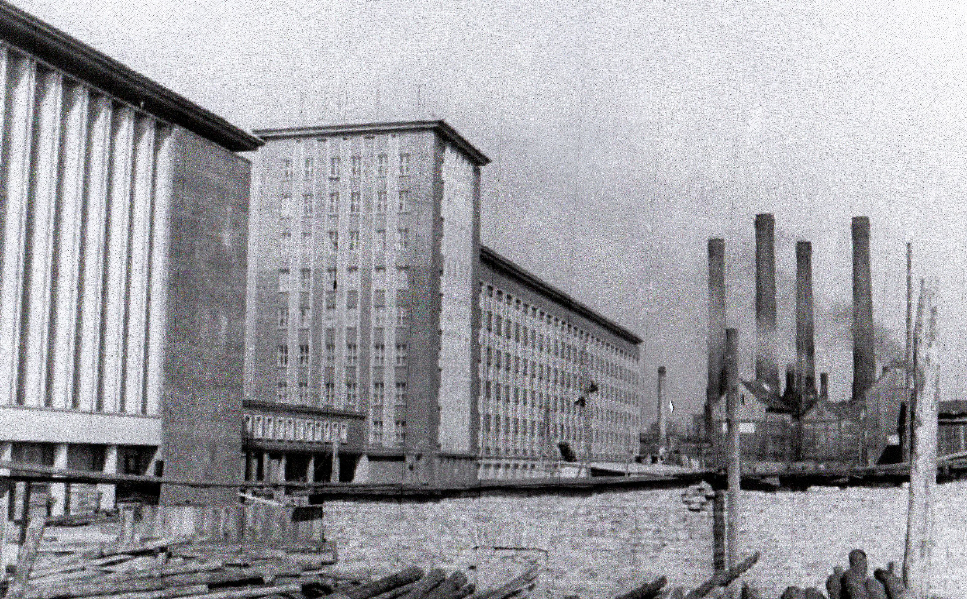 Oben eine weitere Aufnahme vom Bau des Funkhauses Nalepastraße nach Abnahme der Einrüstung im Frühsommer 1952. Derzeit noch ohne Übergangsstrakte von Block A zu Block B bzw. von Block A nach Block C (mit Kultursaal und Kantine), die damals baulich auch erst begonnen wurden.