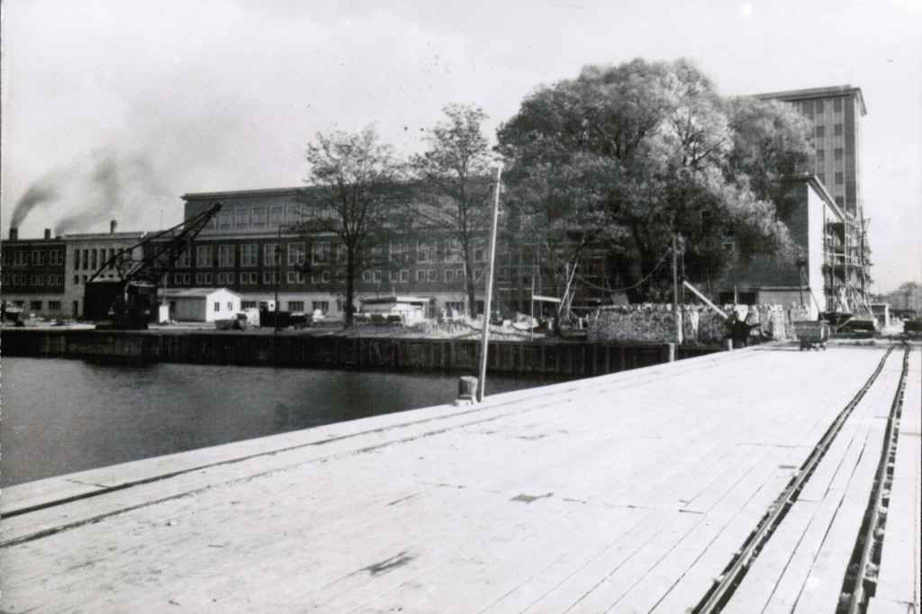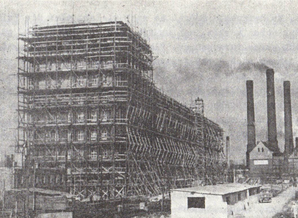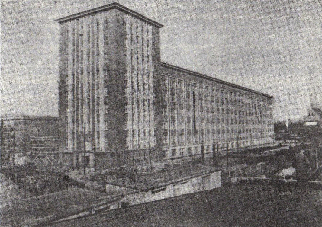 Obiges Foto entstand etwa im Spätherbst 1951 (der Baubeginn war im Juni 1951). Es zeigt die bereits rohbaufertigen Etagenaufsätze auf dem lang gestreckten Hauptkorpus (eine Etage) und dem Turm (drei Etagen).