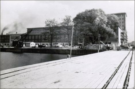 Das Foto zeigt die von der nördlichen Spreeuferseite auf die zu dieser Zeit provisorisch eingerichtete Be- und Entladungsrampe für Baumaterial und Aushub hinter dem Block B des Funkhauses Nalepastraße.