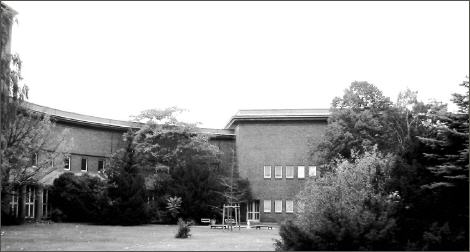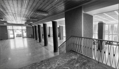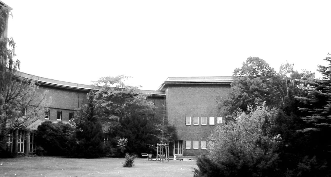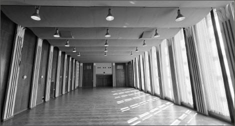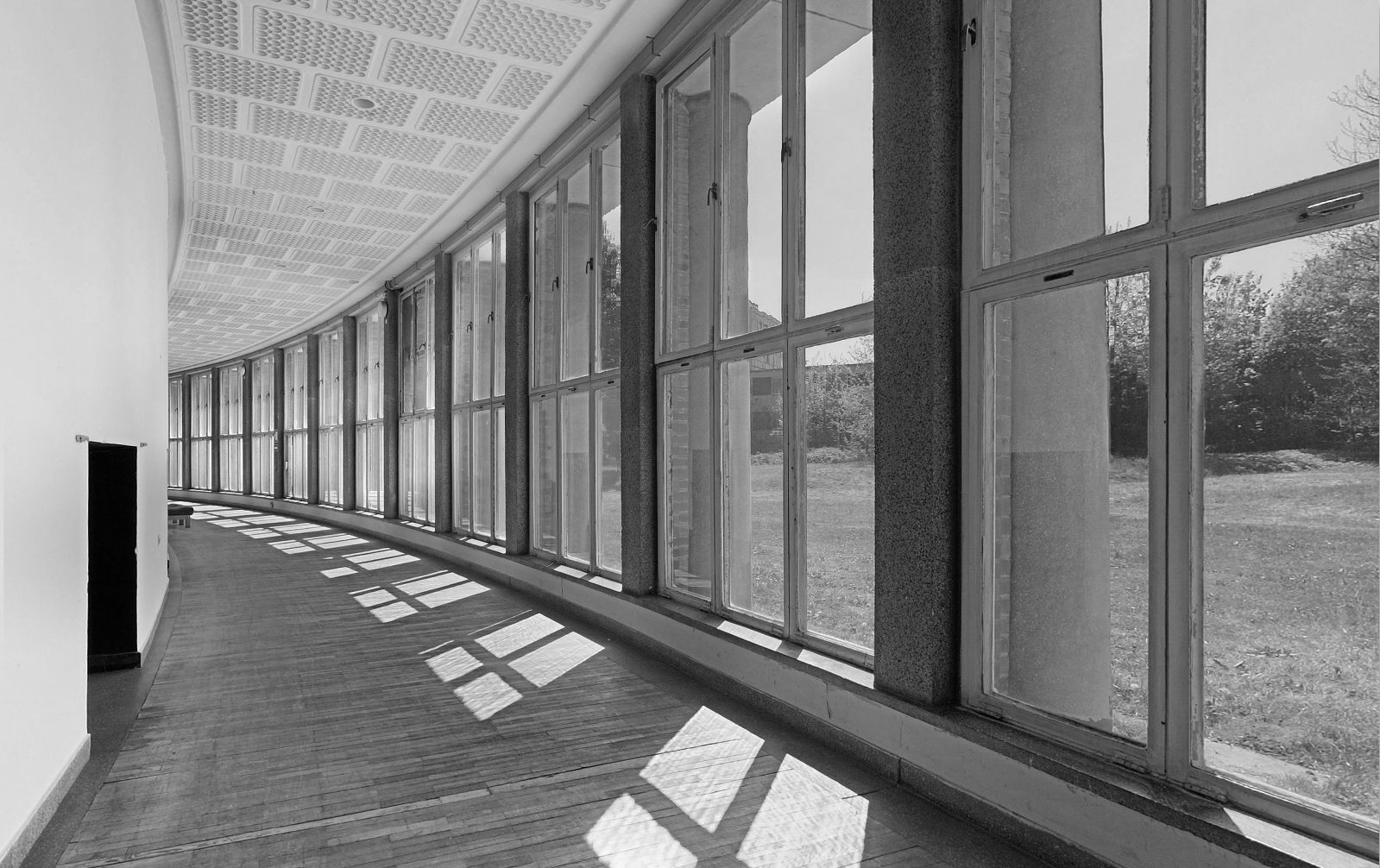 Der verglaste und lichtdurchflutete Bogengang mit seinen großen Stahlfenstern war seinerzeit eine Reminiszenz Franz Ehrlichs an das Bauhaus. Er diente als Foyer und Aufenthaltsraum: